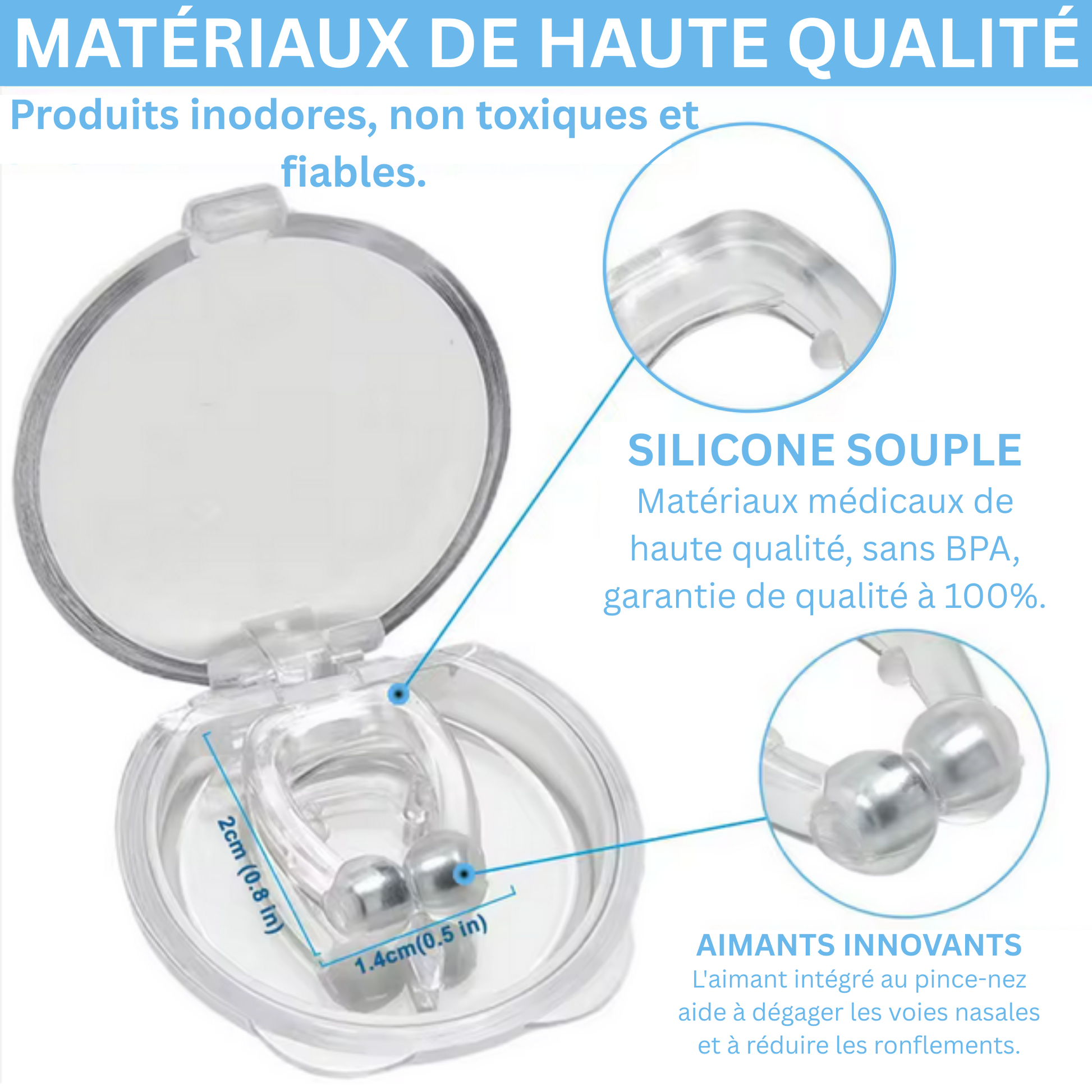 Ce dispositif anti-ronflement magnétique ouvre délicatement les voies nasales pour faciliter la respiration, réduire le ronflement et offrir un sommeil plus calme. Vous vous endormez plus vite et vous profitez d’un vrai repos réparateur.